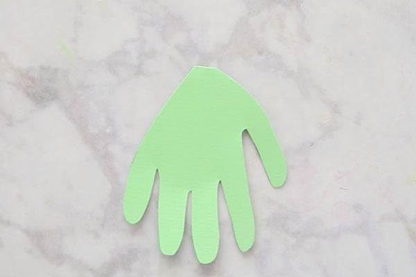 1. First fold your green cardstock in half and trace your hand so that the wrist is on the folded part.