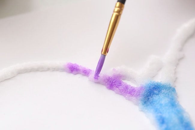 Now watch the magic! As you gently tap your salt with the paintbrush, the salt will soak up the watercolor from your brush and spread like magic!