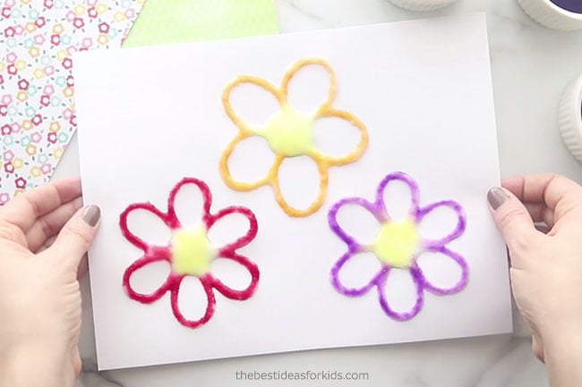 We love how vibrant and crystallized this salt painted art turns out. Kids love to see the paint run along the salt as they do this activity too!
